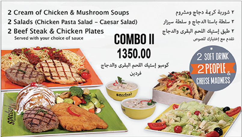 2 Chicken and beef steak plates, served with sauce, 2 cream of chicken and mushroom soups, chicken pasta salad, Caeser salad and bread basket, enough for 2 persons
